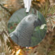 Loro bonito del gris africano de Congo contra un fondo de la palmera con el sol que le da un destello en su ojo.