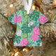 Magenta rosa, verdoso, de color limón y turquesa. Las flores hibiscus y plumeria bailan sobre un fondo de monstera y hojas de palmera. Estas flores se usan comúnmente en ropa para camisas aloha y muu muus creando un diseño que recuerda a las huellas hawaianas de los años 50 y 60.
