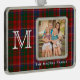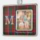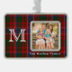 Festividad de adorno de fotos de personalizado de yeso hecho en el clásico patrón tartán de MacRae rojo, verde, azul, verde y blanco. Un gran monograma blanco de una sola letra, en el lado izquierdo del personalizado de ornamento y blanco, debajo del área de imagen. Personaliza con tu foto y texto un maravilloso recuerdo de vacaciones que puedes colgar en tu árbol cada año.