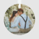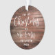 Rústica y moderna cerámica personalizada First Christmas adornado con elegantes letras manuscritas y textura rústica de rosa de madera dorada. Personalice el producto con el año, el nombre de la familia y su foto boda favorita.