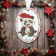 Este es un adorable adorno navideño para cualquier niño que ame los osos panda. Un panda blanco y negro de ojos amplios sostiene un bastón de caramelo y lleva un sombrero de Santa. Debajo de la imagen está el nombre especial de su hijo en verde. La imagen está enmarcada con un patrón de rayas de caña de caramelo rojo, verde y blanco. La parte posterior del ornamento tiene el mismo marco rayado y más campos de texto para que se personalizar. Este diseño funciona bien para un niño o un chica, ¡y puede ser para un hijo, hija, nieto o cualquier niño!