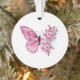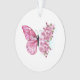 Arreglo floral de mariposa rosa con flores japonesas de cerezo rosadas sobre fondo blanco.