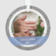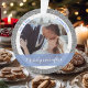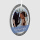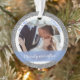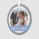 Splashy pero elegante "Merrily ever after" Nuestra Primera Navidad como Sr. y Sra. [Nombre de la familia] foto personalizada ornamento navideño para recién casados, con tipografía cursiva moderna / letras de mano en una elegante banda azul semitransparente, un marco de copos de nieve blancos y plateados y estrellas pequeñas, y otro marco de purpurina plateado simulado. Asegúrese de personalizar al menos las dos fotos (frontal y posterior), el nombre de la familia en la parte delantera y los nombres y el año en la parte posterior.