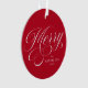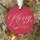 Elegante adorno navideño con "Merry" en el frente en un guión de caligrafía blanca sobre el fondo rojo. Personalice la parte delantera del adorno añadiendo su nombre y el año con letras blancas. La parte posterior del adorno muestra su foto.