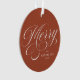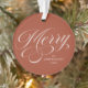 Elegante adorno navideño con "Merry" en la parte delantera en un guión de caligrafía blanca sobre el fondo marrón de terracota. Personalice la parte delantera del adorno añadiendo su nombre y el año con letras blancas. La parte posterior del adorno muestra su foto.