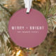 Un elegante y moderno ornamento de fotos de vacaciones con una audaz tipografía que dice "Merry + Bright" en blanco con una mora rosa rosada de frambuesa dusky en el reverso. El saludo y el nombre se pueden personalizar fácilmente para un toque personal. Un diseño moderno, minimalista y contemporáneo de navidades para destacar en esta temporada de vacaciones. La imagen que se muestra es para fines de ilustracion y sólo se sustituye por la suya. La imagen de marcador de posición es de una madre sosteniendo a su hija usando pañuelos neutros y divirtiéndose juntos. Se encuentran en una sala de estar con una decoración minimalista de estilo hogareño decorada para navidades modernos. #navidades #foto #ornament