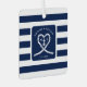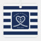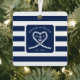 Adorno de Navidad azul náutico y blanco a rayas. Ideal para decorar el árbol de Navidad de una casa de lago o de la Marina (militar). El diseño presenta una cuerda en forma de corazón con ancla y las iniciales de la pareja en el medio. Personalízalo con tus datos.
