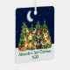 Primeras acuarelas navideñas de animales de bosque Animales de la selva Pine Trees Moon, Starry Sky y Ornamento Metalizado de Nieve. Entre los animales para bebés se encuentran: Oso, ciervo, alce, mapache, conejo conejo conejo, zorro y búho con vegetación forestal. Luces de cadena de vacaciones. Texto verde. Añadir nombre.