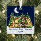 Primeras acuarelas navideñas de animales de bosque Animales de la selva Pine Trees Moon, Starry Sky y Ornamento Metalizado de Nieve. Entre los animales para bebés se encuentran: Oso, ciervo, alce, mapache, conejo conejo conejo, zorro y búho con vegetación forestal. Luces de cadena de vacaciones. Texto azul. Añadir nombre.