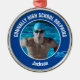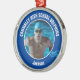 This cool customized high school swim team photo gift features white typography of your team and player name on a Christmas ornament with a swimmer icon on a blue background. Personalize with your swimming student's photograph and class year for a great commemorative keepsake.