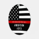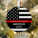 Ornamento personalizado de la línea roja delgada - bandera estadounidense con colores de la bandera del bombero, diseño rojo negro moderno. Personalice con el nombre del bombero o departamento de bomberos. Este ornamento de bomberos personalizado es perfecto para departamentos de bomberos, servicio de bomberos, o como obsequio conmemorativo y obsequios de Navidades de bomberos o ladrones de carga. Solicite estos ornamentos de bomberos al por mayor para regalos de la academia de bomberos o del departamento de bomberos, navidades de bomberos abastecedores de peregrinos. DERECHOS RESERVADOS © 2020 Judy Burrows, Black Dog Art - Todos los derechos reservados. Bombero Personalizado Fuego de la Línea Roja Delgada Ornamento Metalizado
