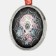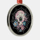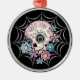 Calavera de azúcar del Día de los Muertos diseñada en colores pastel con flores colocadas en una telaraña.