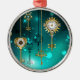El oro, las llaves antiguas con engranajes y diales cuelgan de las cadenas de oro sobre un fondo verde luminoso.
