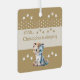 Ornamento metalizado de dos lados. Una idea de regalo para un recién nacido, con un bonito leopardo, estrellas y puntos de polka. Personalizar con un nombre / shhh 'nombre del bebé' está durmiendo. La frase 'Sweet Dreams' está en la espalda. Marrón y blanco.
