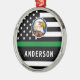 Delgado ornamento militar con bandera de la Línea Verde, ¡una perfecta incorporación a la decoración de tus Navidades! Muestra tu apoyo a los valientes hombres y mujeres que protegen nuestras fronteras, parques y vida salvaje. Esta decoración moderna y sencilla cuenta con la bandera estadounidense con una delgada línea verde que representa a los oficiales federales encargados de hacer cumplir la ley, las patrullas fronterizas, los guardianes del juego, los guardabosques, los oficiales de conservación, el ejército, la marina y los marines. Este adorno, hecho con materiales de alta calidad, está diseñado para que dure muchos años. Cuelgue en su árbol, corona o en cualquier otro lugar donde quiera mostrar su amor por nuestro país y por los que lo sirven. Hace un regalo reflexivo para cualquiera en el ejército o en las fuerzas del orden, o para cualquiera que quiera mostrar su apoyo a estos héroes durante la temporada navideña. Celebra las festividades con estilo con el ornamento militar de la delgada bandera verde. Ordena el tuyo hoy y exhibe orgullosamente tu patriotismo y gratitud por los que defienden nuestra libertad. DERECHOS RESERVADOS © 2023 Judy Burrows, Black Dog Art - Todos los derechos reservados. Delgada Línea Verde De Logo Personalizado Ejército Ornamento Metalizado Militar