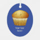 Un gráfico semirealista de muffin con texto personalizado en la parte delantera (¿tal vez agregar un nombre o evento?) y más espacio en la parte posterior para un mensaje personal o dedicación. El muffin fresco y liso, con una parte superior de esponja que sale de su funda de papel, se ve en un fondo azul, pero se puede elegir otro sombra para que coincida con la decoración (se recomienda utilizar la herramienta de diseño).