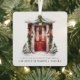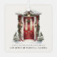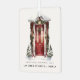 Letrero moderno de "Deseos de Vacaciones" con acuarela en puerta principal decorada con ornamento metálico de vegetación navideña.