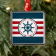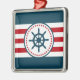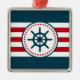 Diseño náutico con decoración de ruedas de vela en forma redondeada con estrellas sobre fondo rayado rojo, azul y blanco