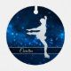 Este elegante adorno cuenta con una silueta plateada patinadora de hielo frente a un fondo azul bonito con pequeñas estrellas. Su nombre es plateado en una pancarta semitransparente enmarcada en un falso purpurina blanco. La parte posterior del adorno tiene el mismo fondo azul con tres campos de texto personalizado en el centro. Perfecto para esa hija, nieta o sobrina que es patinadora.