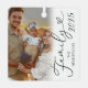 Moderno adorno de navidad de 2022 con un fondo blanco simple, una foto a cada lado para que la reemplace con la suya, la palabra "familia" en un elegante guión de tipo corazón, el nombre de su familia y el año.