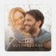 Elegante Navidades de caligrafía moderna Ornamento Metalizado de fotografía familiar es un elegante y moderno adorno vacacional con tu apellido que aparece en la tipografía clásica, combinado con caligrafía moderna en blanco sobre tu fotografía de tamaño completo.