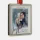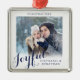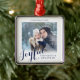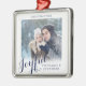 Este ornamento de árbol de Navidad ofrece un marco de foto cuadrado acentuado con la palabra "alegre". La foto aparece con un borde blanco para un aspecto limpio y elegante. Personaliza tu foto favorita y tus nombres.