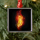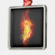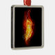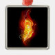 Una brillante pluma de pavo real hecha de fuego y llama sobre fondo negro.