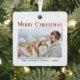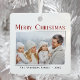 Modernos adornos navideños minimalistas con un estilo elegante. Estos brillantes adornos navideños ofrecen un sencillo pero sofisticado saludo tipográfico que dice "Feliz Navidad (en un color rojo festivo), Su nombre familiar y el año". Este diseño personalizado presenta su foto o imagen familiar favorita en la parte delantera, resaltada por un marco de gradiente moderno único en un fondo blanco de moda. La parte posterior del adorno incluye un espacio de texto para el mensaje de su personalizado.