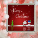 Un lindo ilustracion de Navidades con un muñeco de nieve, Santa Claus, un árbol de Navidad, nieve y estrellas de fondo rojo.