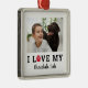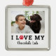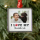 Este moderno ornamento vacacional para los amantes del perro presenta la frase "I LOVE MY" en letras modernas y audaces en negro con un acento de huella de pata animal de color rojo. Personalice el guión negro con el tipo de mascota o el nombre del mascota Añadir una foto horizontal favorita. Color del fondo blanco.