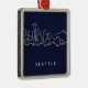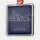 Características del este diseño un bosquejo dibujado mano del horizonte de Seattle en un fondo azul marino.