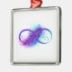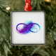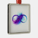 Símbolo infinito con una hermosa pluma pintada de color violeta y azul brillante sobre fondo blanco.