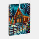 Ornamento navideño personalizado. Una hermosa cabaña de troncos iluminada en la víspera de los Navidades con luces de Navidad y árboles con nieve sobre los pies.