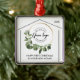 Envíe un regalo atento a sus clientes inmobiliarios. Un memorable adorno navideño por su decoración que dice "Feliz Primera Navidad en tu nuevo hogar". Presenta mi moderno ilustracion de corona con un contorno de casa. Personalice el logotipo, año y mensaje.