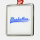 Manhattan, Nueva York, escrito con un swash (cola). Fuentes en blanco y azul. Diseño de texto original.
