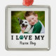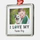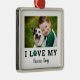 Este moderno ornamento vacacional para los amantes del perro presenta la frase "I LOVE MY" en letras modernas y audaces en negro con un acento de huella animal de color verde del bosque. Personalice el guión negro con el tipo de mascota o el nombre del mascota Añadir una foto horizontal favorita. Color del fondo blanco.