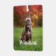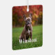 Modern Custom Name Photo Holiday metal ornament with your pet’s name in a bold white serif font.