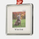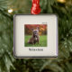 Modern Ivory Custom Name Photo metal ornament with your pet’s name in a gray, bold serif font. Your pet's photo is framed with a thin white line on an elegant ivory background.