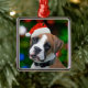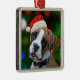 Fawn y el perro boxeador blanco usa un sombrero de Santa muy pequeño y se ve lindo con Navidades brillantes luces en segundo plano amantes de los perros Navidades adorno de vacaciones