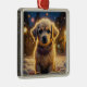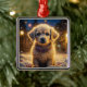 Un perro cachorro lindo afuera mientras nieva copos de nieve iluminados adornos navideños.