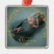 El ornamento de fotos de Navidades de personalizable para recién nacidos muestra una foto de bebé favorita a cada lado, con "Nuestra primera Navidad" elegantemente cubierta de caligrafía dorada. Personalízalo con el nombre y la fecha de su bebé.