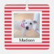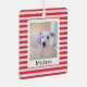 Este adorable ornamento tiene rayas rosas y rojas y una foto de Olive, una adorable mezcla de labradores con un nombre de personalizable y saludo en la espalda.