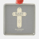 Esta cruz crema se distingue por el fondo gris plateado. El diseño de puntos en la cruz y en el fondo crea un aspecto de bebé de bonito suizo. Este regalo, recuerdo, obsequio o fiesta es esencial para felicitar a los padres por la sagrada dedicación de su bebé.