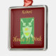 Divertido adorno navideño con un diseño escudo de estilo medieval para jugadores de pickleball, ha cruzado espadas en escudo con cancha de pickleball, y el texto dorado de "House of Dink" . Personalización con nombre o monograma