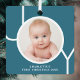 Este elegante adorno de foto de primera Navidad de bebé está decorado con la palabra JOY en tipografía blanca sobre un fondo azul verde azulado. Personalizable fácil con tu foto, nombre y año.
