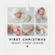 Modernas 5 fotos múltiples en una cuadrícula mostrando tus fotos favoritas de recién nacidos para su primer adorno metalizado de Navidad.