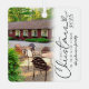 Ornamento minimalista de navidad de la casa con un fondo blanco simple, una foto a cada lado para que la reemplace con la suya propia, el dicho "primera navidad en nuestra nueva casa" con un elegante guión de caracter cardíaco, el nombre de su familia y el año.