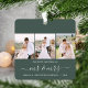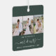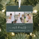 Conmemorar tu primera Navidad como recién casados con este hermoso adorno de keepsake moderno. El texto en blanco dice "Nuestra primera Navidad como," con las palabras "mr & mrs" en un elegante guión de escritura a mano con flores antes y después. Reemplace las tres imágenes de ejemplo con sus fotos verticales favoritas y agregue su(s) apellido(s) y el año en blanco sobre un fondo verde oscuro.