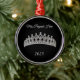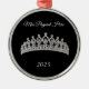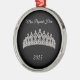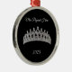 Christmas ornament is shown in a round shape with a sparkling pretty silver crystal tiara, with white text on a black color background.
