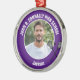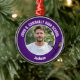 This cool customized high school lacrosse player photo gift features white typography of your team and player name on a Christmas ornament with a ball and rackets icon on a purple background. Personalize with your athlete's photograph and class year as a proud sports parent.